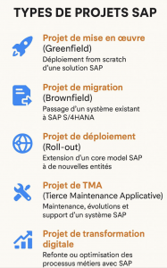 Thomas Billoir (auteur du document) Quand on parle de projets SAP, on parle pas uniquement de migration ou de déploiement… il existe plusieurs typologies de projets, chacun avec ses objectifs et ses enjeux ! 📌 1. Projet de mise en œuvre (Greenfield)Un déploiement from scratch, souvent pour une première implémentation SAP.🎯 Objectif : concevoir une …