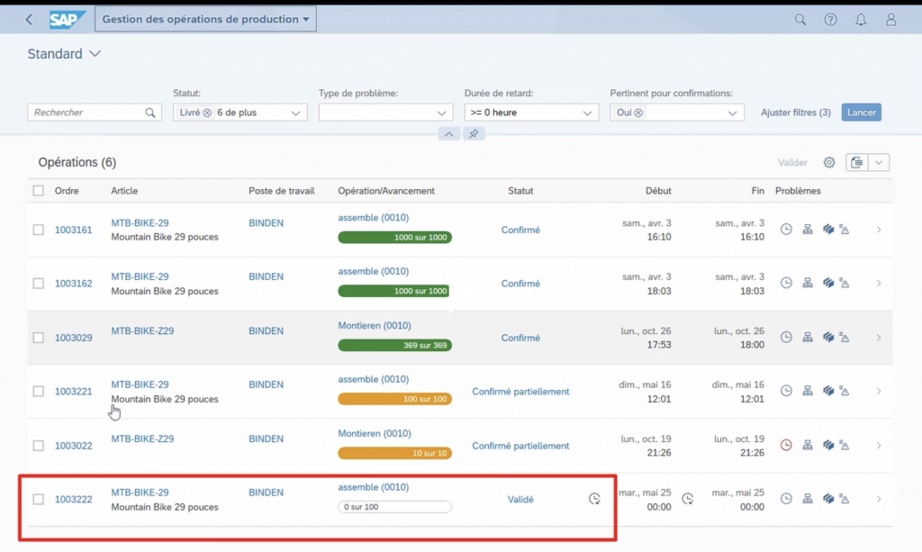 Plusieurs ordres de fabrication sont visibles. On sélectionne l’ordre de fabrication 1003222 et on clique sur lancer.