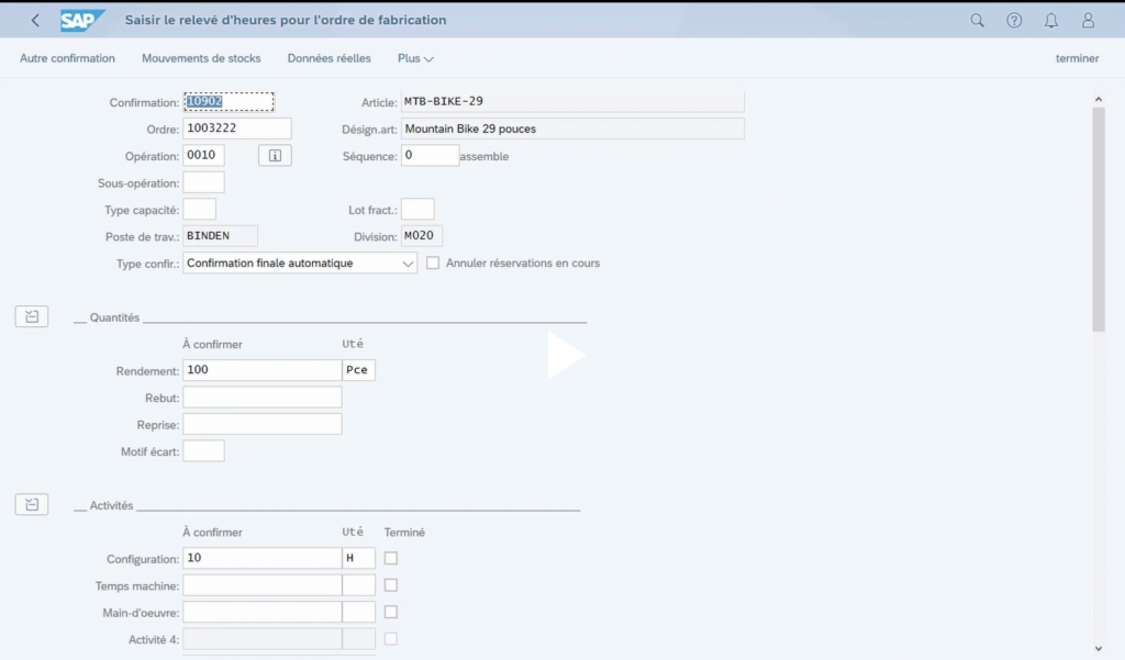 On clique sur Confirmer opération. On y renseigne le nombre de pièces à produire dans quantités et le nombre d’heures de production dans activités.