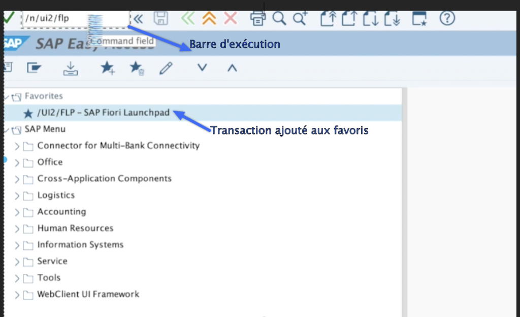 - Y accéder depuis la SAP GUI (interface graphique utilisateur SAP) en utilisant depuis la barre d’exécution, le code de transaction (tcode) :/n/ui2/flp ou avoir mis au préalable ce code dans vos favoris.
