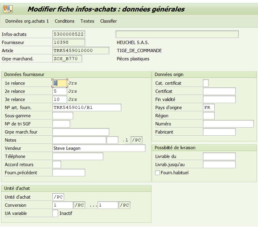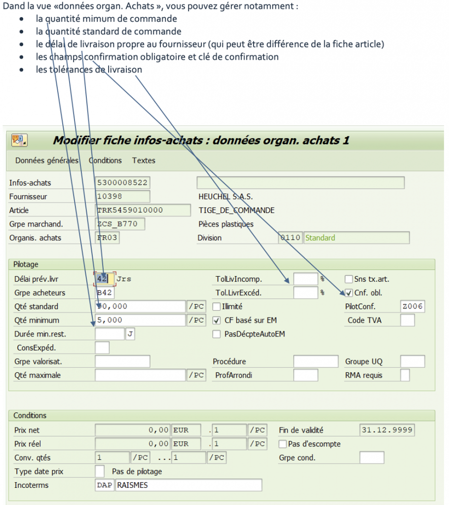 Donc si une donnée est présente dans un contrat, elle sera prioritaire sur la donnée présente dans la fiche info-achats, la master data fournisseur et dans la fiche article. Et certaines données ne sont pas présentes dans tous les documents ce qui explique notamment qu’une fiche info-achats et crée en parallèle à un contrat.