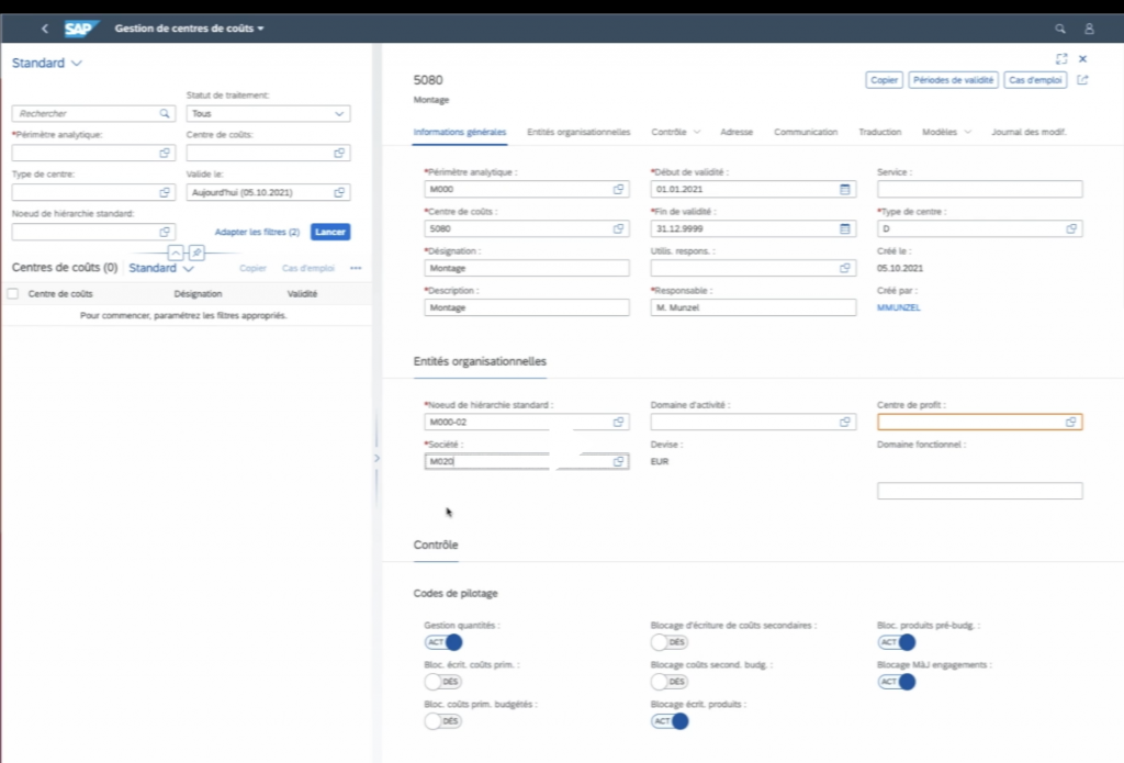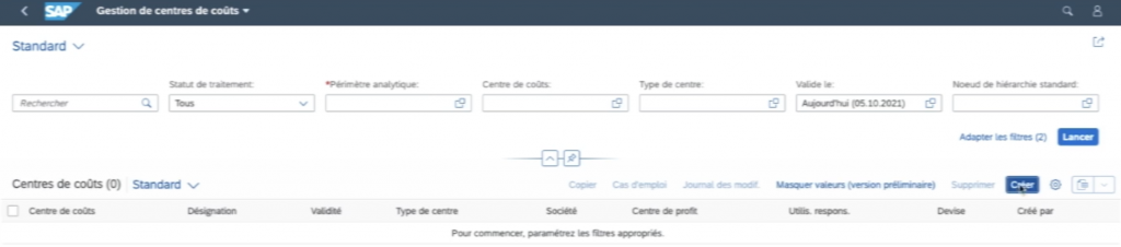 Pour créer un centre de coûts sur SAP on tape le code de transaction KSH1 dans la barre de recherche ou création de centre de coûts.