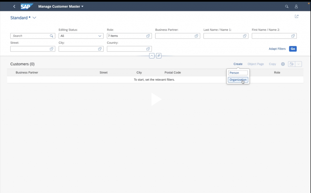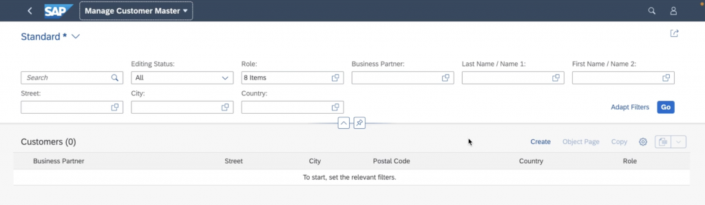 Pour créer un client sur FIORI on ouvre l’application : Manage Customer Master data ou on tape le code de transaction VA00.