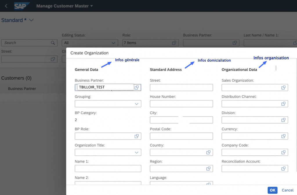 Une fenêtre pop up s’affiche avec 3 colonnes (General Data, Standard Address, Organizational Data).