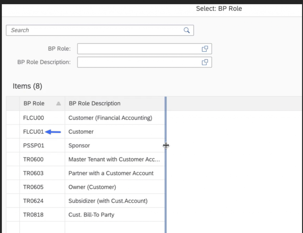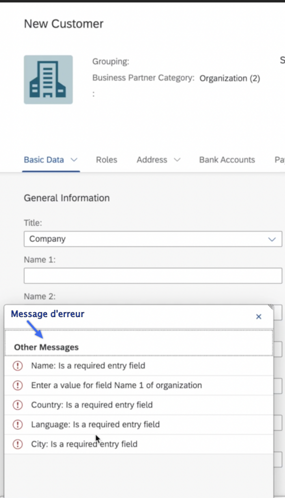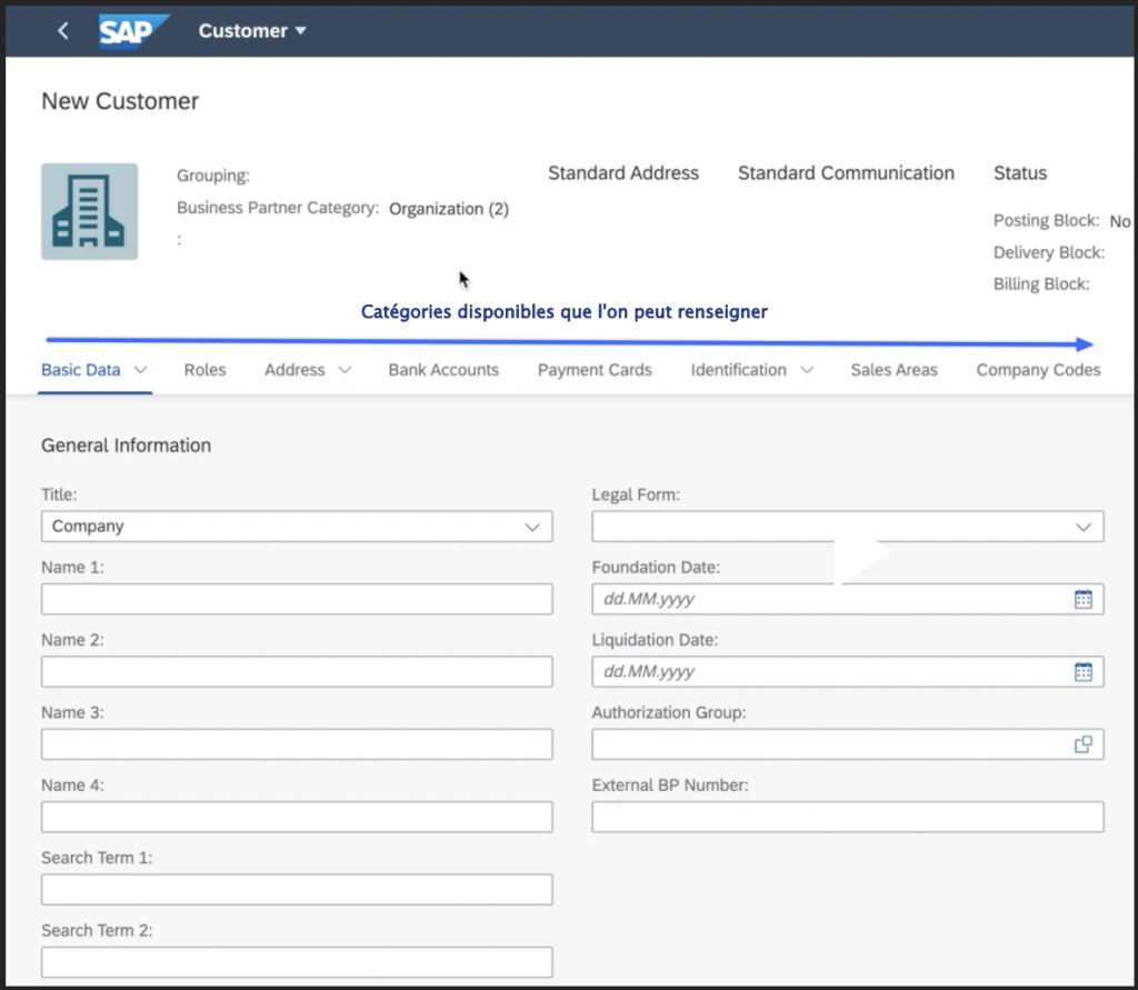 Dans la colonne General Data ce qui est important de définir c’est le Business Partner Role (BP Role). Nous allons sélectionner ici customer (FLCU01).