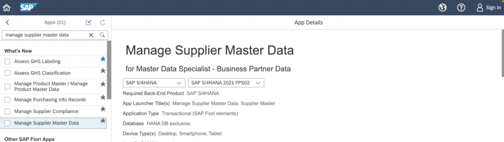 On voit ici que l’application a été conçue sur Fiori, elle permet de créer, de modifier ou d’afficher des suppliers.