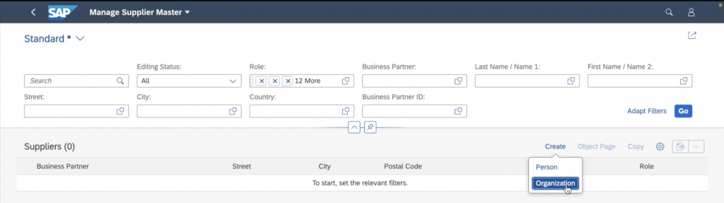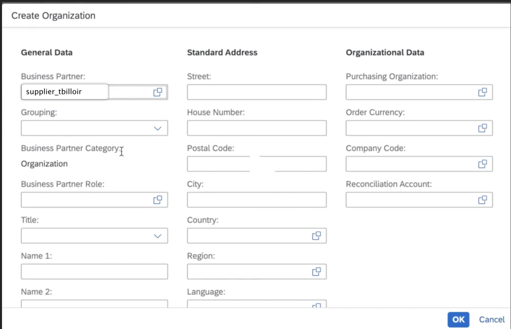 Sur la page manage supplier master on va crée notre business partner (supplier).