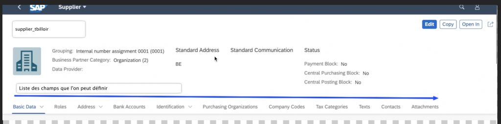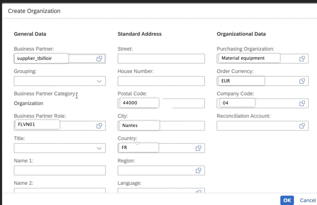 Et on va lui attribuer un Business Partner Role dans le cas présent, FLVN01 (Supplier) ainsi qu’une ville, un pays, une organisation d’achat.