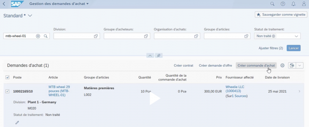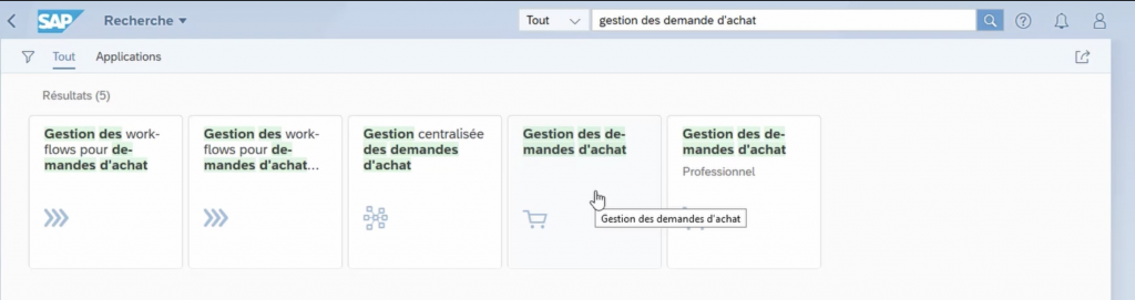 Pour créer une commande d’achat on tape gestion des demandes d’achat dans Fiori ou la transaction ME21N.