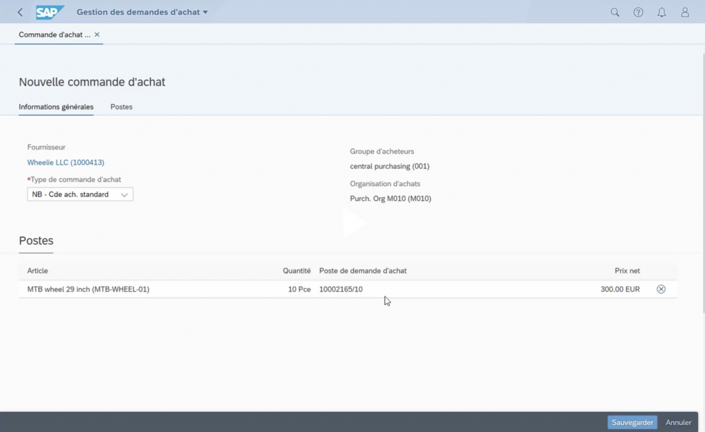 La page nouvelle commande d’achat s’ouvre. On voit de façon générique que celle ci est rattachée à un groupe d’acheteurs et à une organisation d’achats. On clique sur sauvegarder.