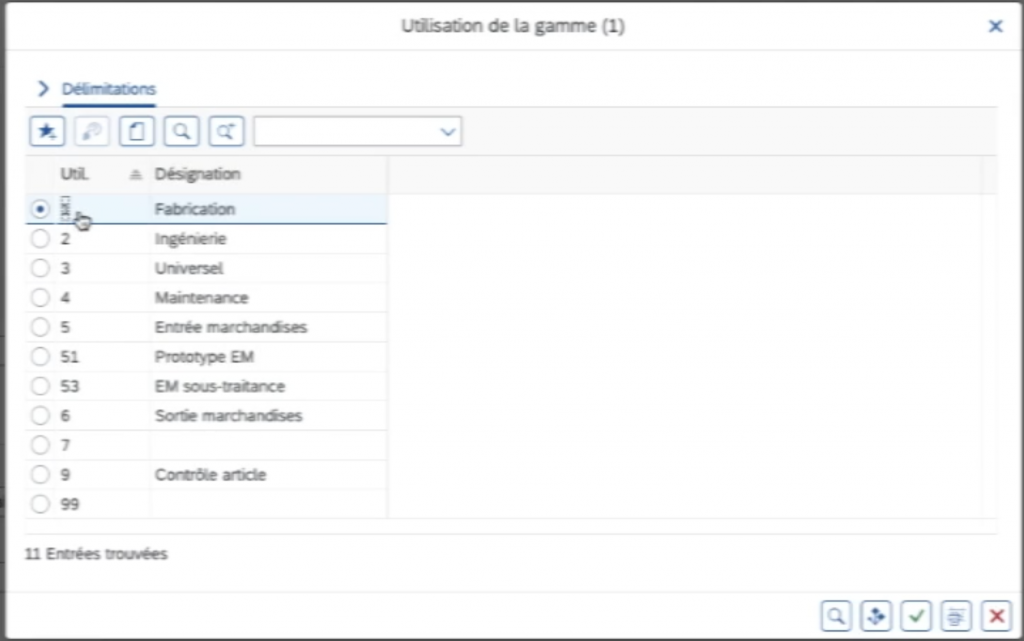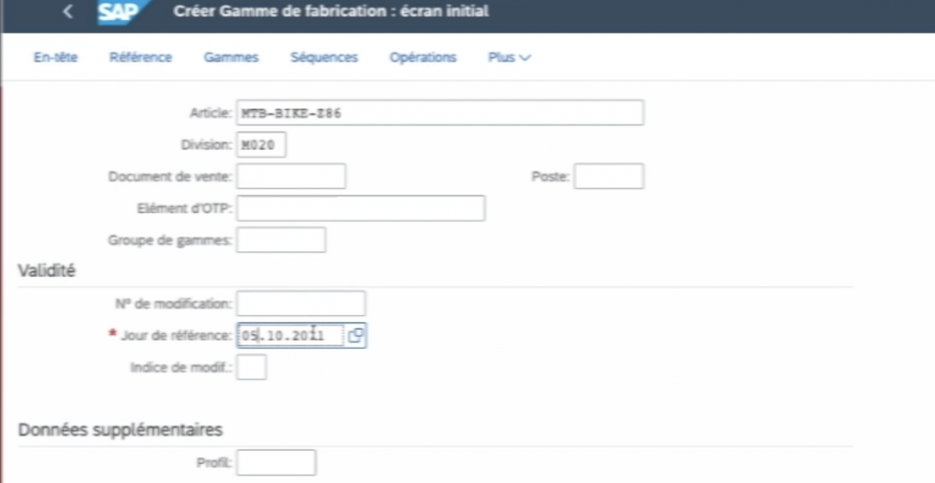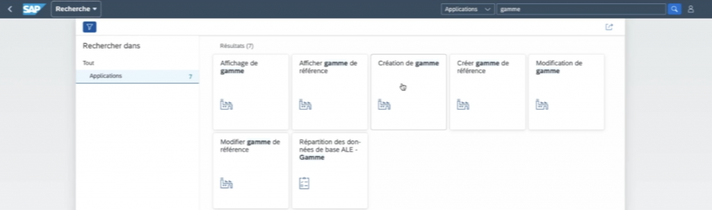 Pour créer une gamme sur SAP on tape le code de transaction CA01 ou on navigue dans la barre de menu Fiori et on tape gamme puis création de gamme.