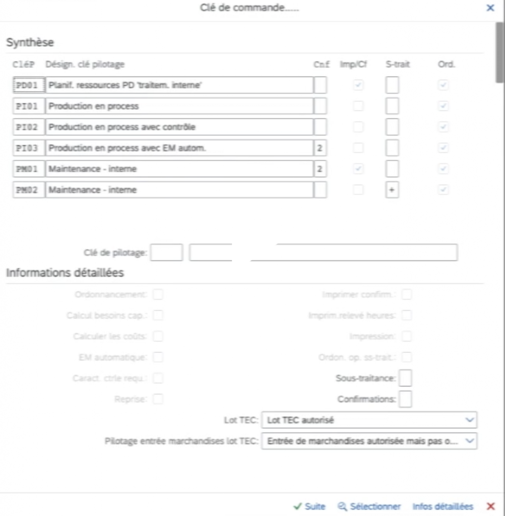On sélectionne le poste de travail définit au préalable et la clé de pilotage qui permet de savoir si la production est réalisé en interne ou externe.