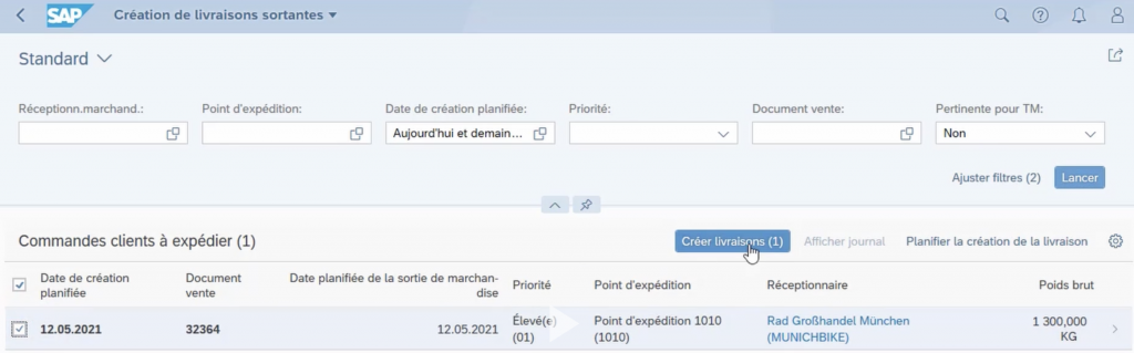 La page de l’application s’ouvre, on sélectionne ici la commande crée au 12.05.2021 et on clique sur créer livraisons.
