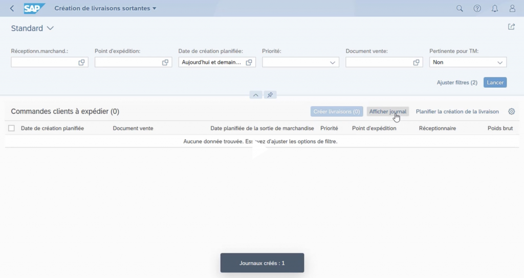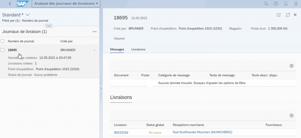 La page analyse des journaux de livraisons s’ouvre. On voit que la livraison 80033334 a été crée elle appartient au journal 18695.