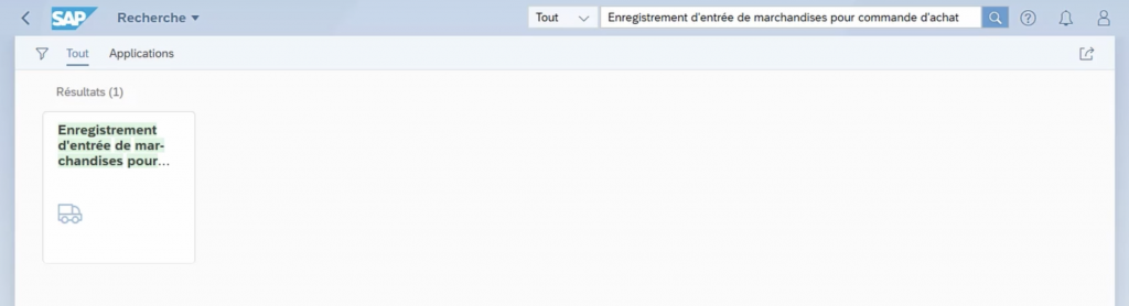 On va dans la zone de recherche et on tape enregistrement d’entrée de marchandises pour commande d’achat ou la transaction MIGO