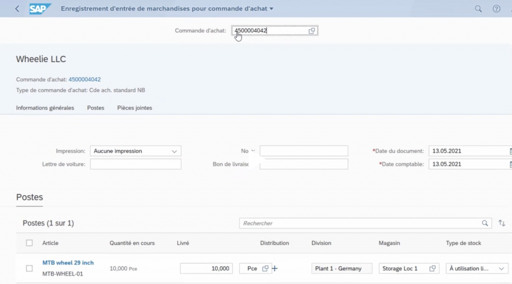 On renseigne le numéro de la commande d’achat, le poste s’affiche.