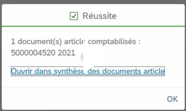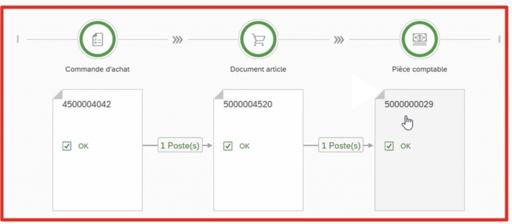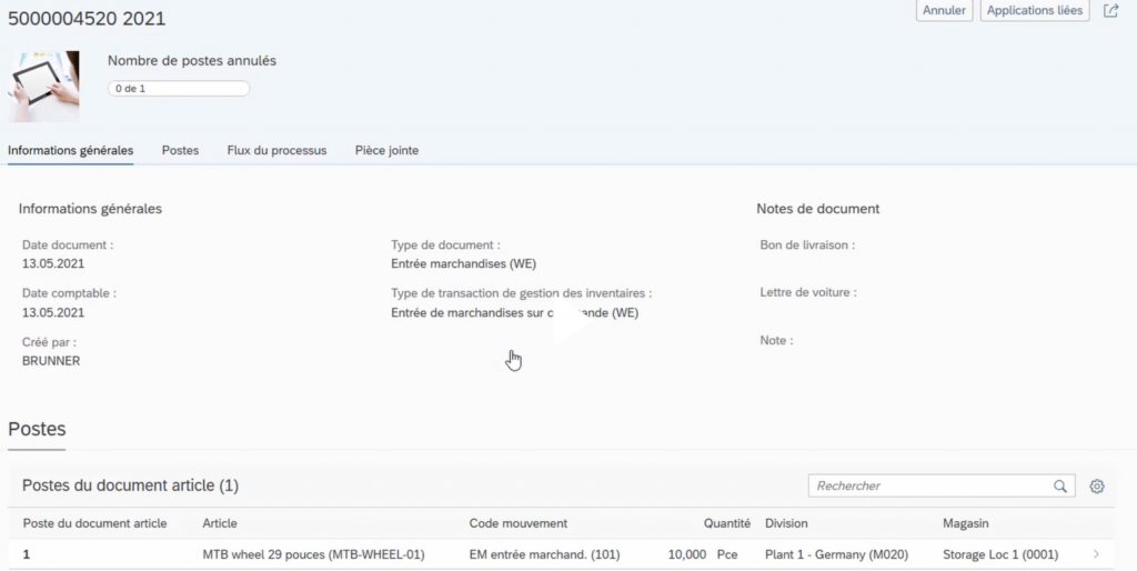 On défile la page pour avoir accès aux informations du flux du processus, on peut y voir qu’une pièce comptable a été crée.