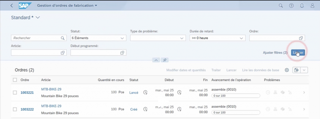 On sélectionne ici le deuxième ordre de fabrication et on clique sur lancer.
