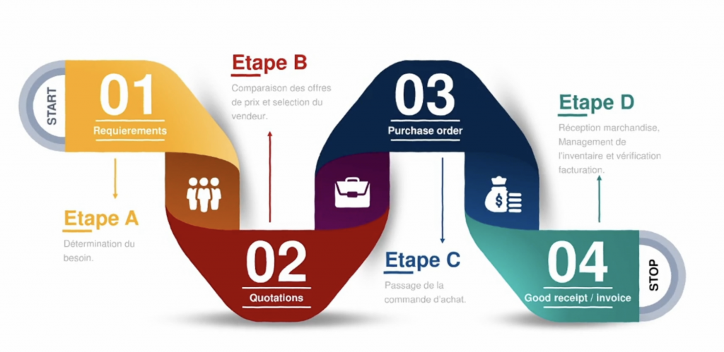 La première étape est la détermination du besoin ex : achat d’une pièce moteur. Une demande est réalisée au service d’achat, qui compare les prix des différents fournisseurs en fonction de la fiche info achat et contrat d’achat réalisé (conditions de paiement, délai de livraison et production sur la pièce etc…). La commande est crée, la livraison est ensuite effectué et rangé en magasin (good receipt) ou livré à un client final (dropshipment ou good issues) et payée à la réception de la facture.