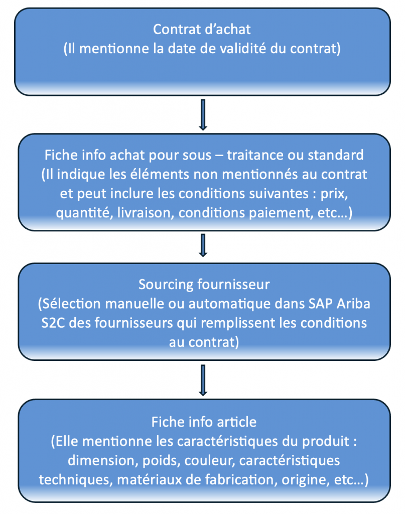 L’ordre des documents dans une procédure d’achat est mentionné ci – dessous. Si une donné est présente dans un contrat elle sera prioritaire sur la donnée présentes dans une fiche info achats, un sourcing fournisseur ou une fiche info articles. Certaines données ne sont pas présentes dans tous les documents ce qui peut expliquer la création d’une fiche info achats en parrallèle à un contrat.