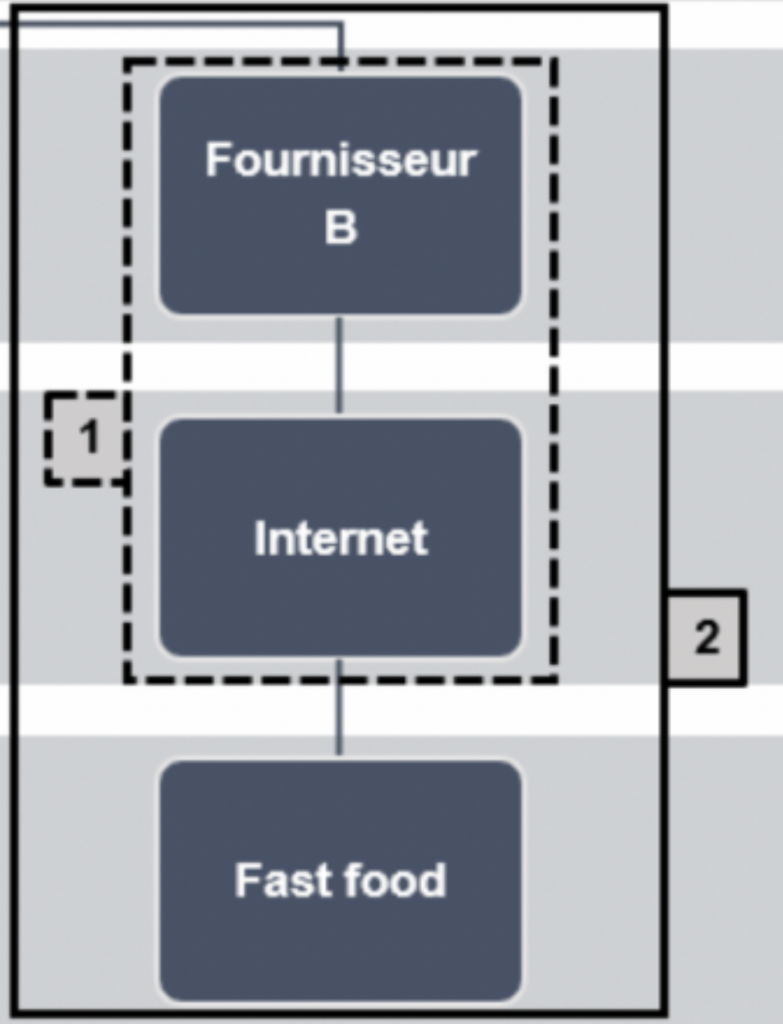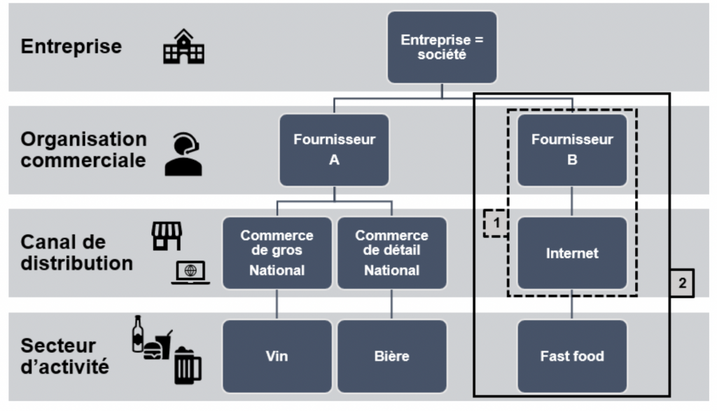 La combinaison de l’organisation commerciale et du canal de distribution s’appelle également la chaîne de distribution (représentée dans la figure par le cadre en pointillé n° 1) ; la combinaison de l’organisation commerciale, du canal de distribution et du secteur d’activité est appelée domaine commercial (représenté dans la figure par le cadre en trait plein n° 2).