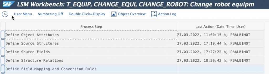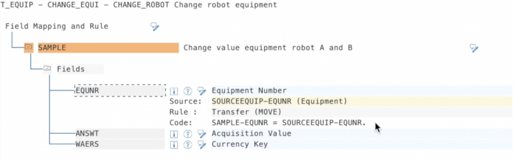On voit bien que l’ equipment number est bien enregistré sur le champ source. Il faut réitérer l’opération pour l’acquisition value et le currency key et on clique sur sauvegarder.