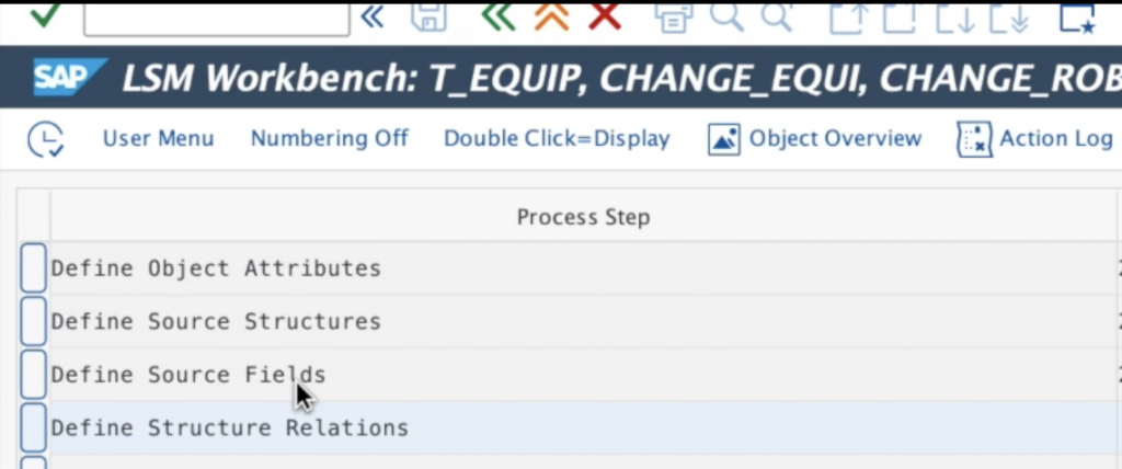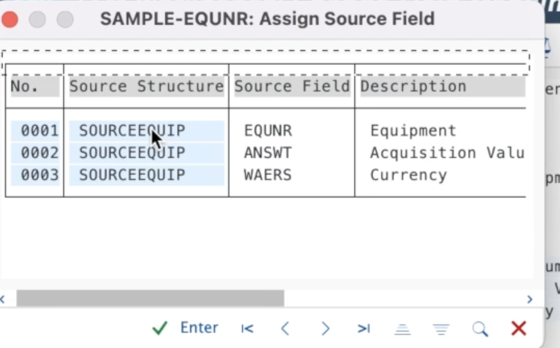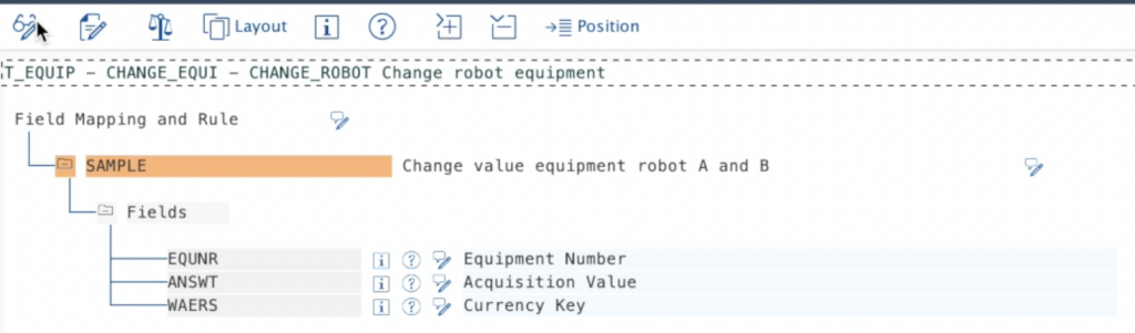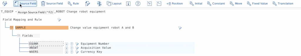 On va ici définir notre mapping avec les champs liées à notre structure source. Pour réaliser l’opération on clique sur le bouton modification, il faut alors sélectionner les différents champs de notre sample. Par exemple je sélectionne EQUNR et j’appuie sur le bouton source fields en haut de l’écran.