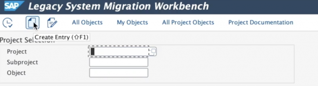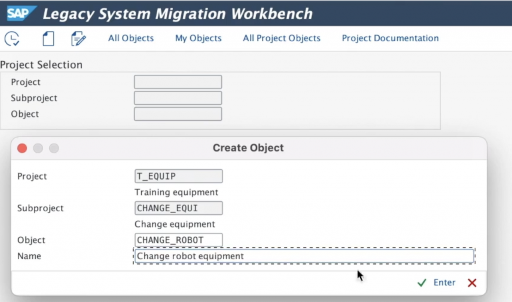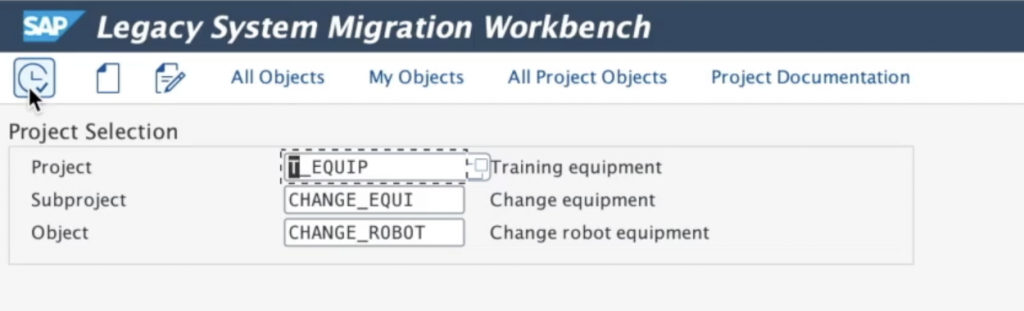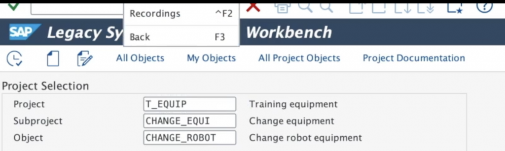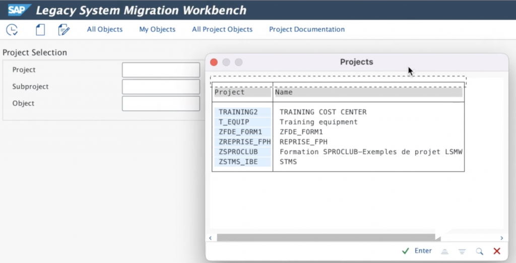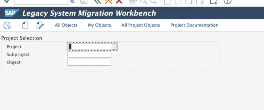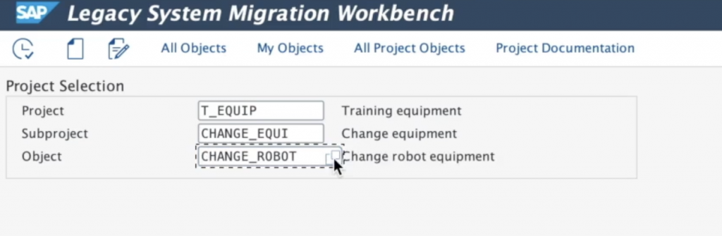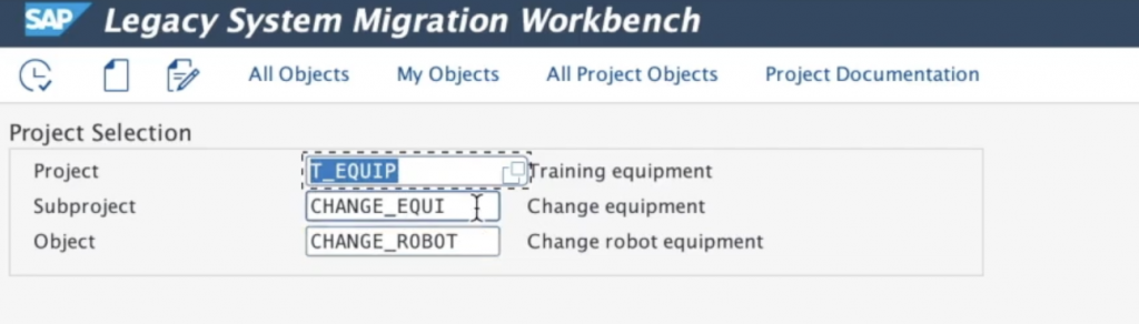 On arrive sur la fonctionnalité LSMW. Ici on va décrire un projet et ses attributs (sous – projet) et objet. Le projet se définit comme le projet dans lequel le programme va s’inscrire. Le sous projet est plus précis, il permet de catégoriser plusieurs projets au sein d’un même projet. L’objet correspond au programme de reprise des données.