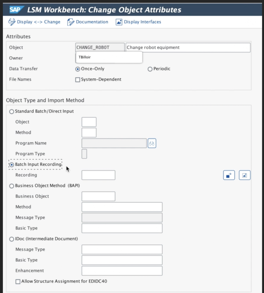 On sélectionne dans le cas présent le Define Object Attributes et on clique sur Entrée. La page objet s’affiche, on sélectionne Once – Only au niveau du transfert des données. On sélectionne ici Batch Input Recording qui permet de répéter un échantillon avec des données qui changent. L’échantillon (sample) que l’on va créer s’appelle un recording.