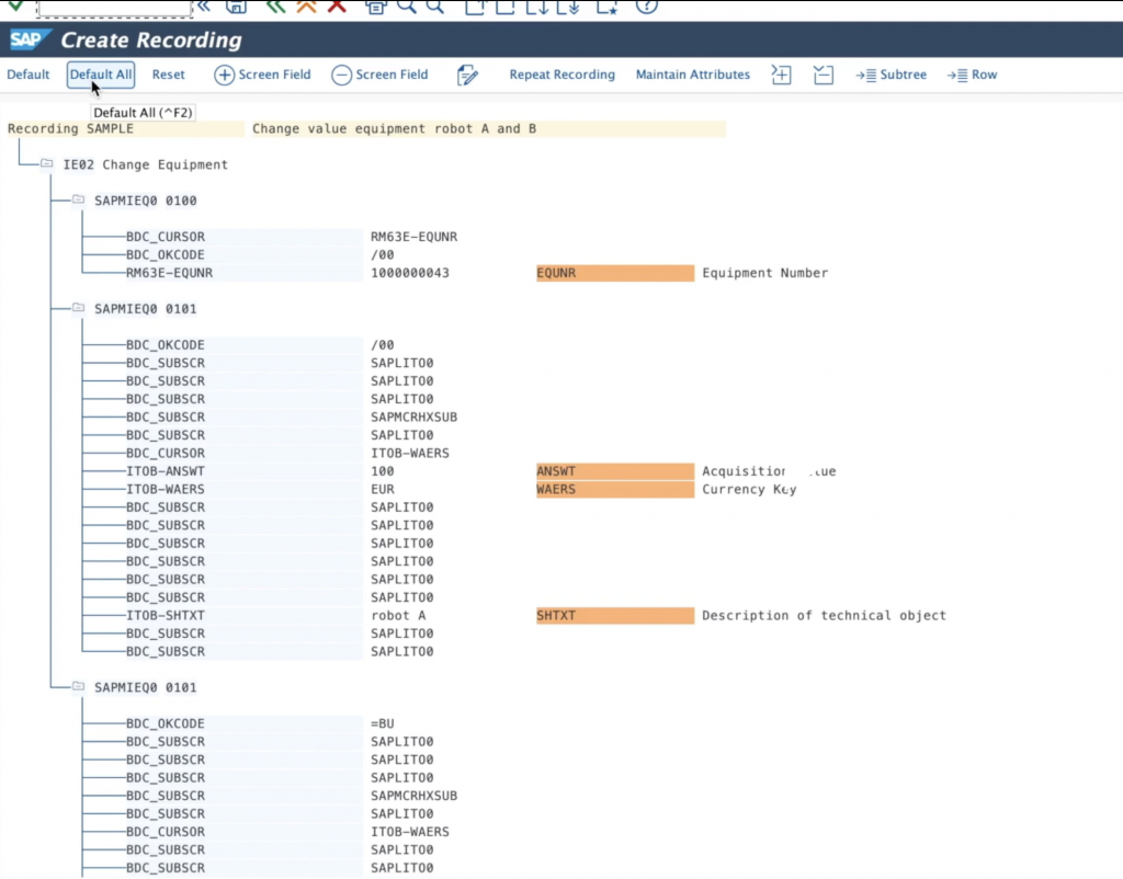 La page Recording s’affiche avec les équipements que l’on souhaite conserver et modifier. Il est judicieux de configurer cette page en Defaut All, pour afficher le nom et la description du champ.